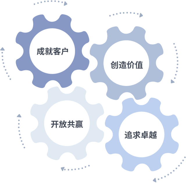 成就客户是一切决策的出发点,,,,创造价值是衡量所有工作的标准,,,追求卓越是我们做事做人的态度,,,开放共赢是我们的格局也是最终的结果。。。。价值观的齿轮环环相扣,,,推动着组织里的每个人不断向前。。